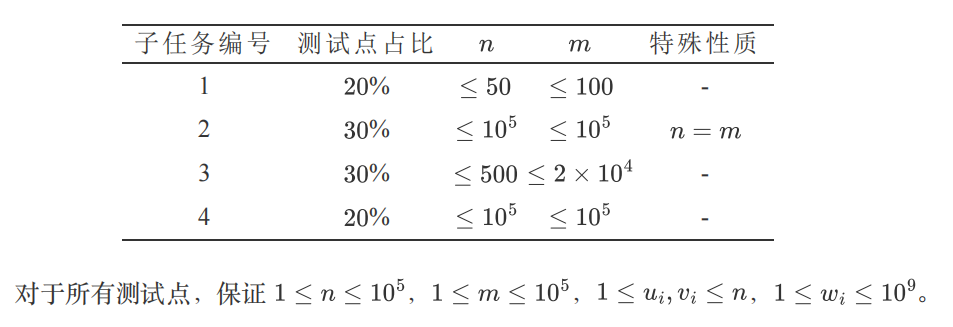 第一行,两个正整数n,m,分别表示图的结点数与边数。 接下来m行中的第i行(1<=i<=m )包含三个正整数ui,vi,wi ,表示图中连接结点ui 与结点vi 的边,边权为wi 。